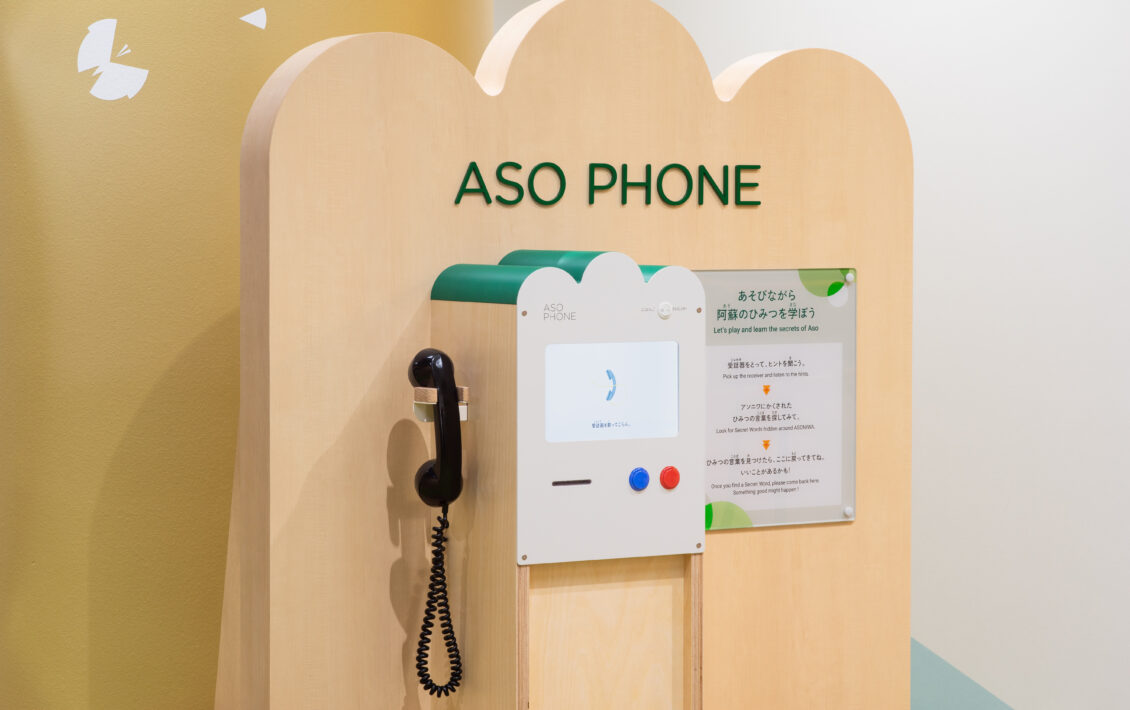 “ASONIWA”は草原をモチーフとした体験エリアと、小さな子供でも遊ぶことができる4つの小部屋で構成。体験エリアはアナログとデジタル双方の魅力を兼ね備えたコンテンツ“ASO PHONE”で、阿蘇の魅力を表すキーワード探しミッションを楽しむことができる場となっている。ミッション体験を通じて阿蘇を好きになってもらうきっかけを提供するとともに、体験後には、その魅力をより深く紹介している近隣施設をご案内する体験設計とすることで、キッズパーク内はもちろん、阿蘇全体を楽しむための拠点施設となることを目指した。