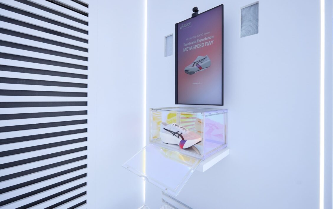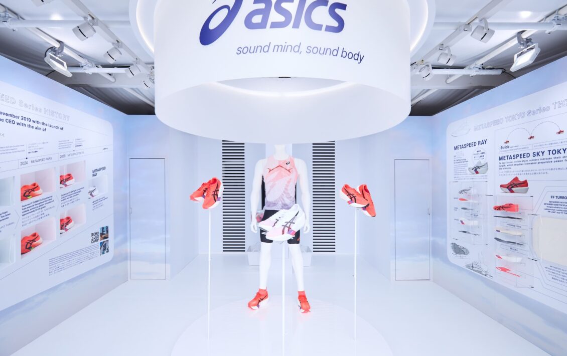 同シリーズの歴史紹介、129gのシューズを実際に触れるコンテンツ、軽さの仕組みに迫るマテリアル展示を1WAYで設計。